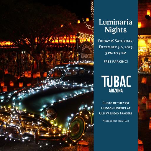 Graham Bell Gallery 1 Will Rogers Ln, TumacacoriLuminaria Nights de Tubac takes place the first Friday and Saturday in December, lighting up the Historic Village with beautiful luminarias! Come enjoy delicious treats, shopping, music, and more. Shops, art galleries, and restaurants will be open late for you to explore and get some holiday shopping done. Don’t miss this magical evening!